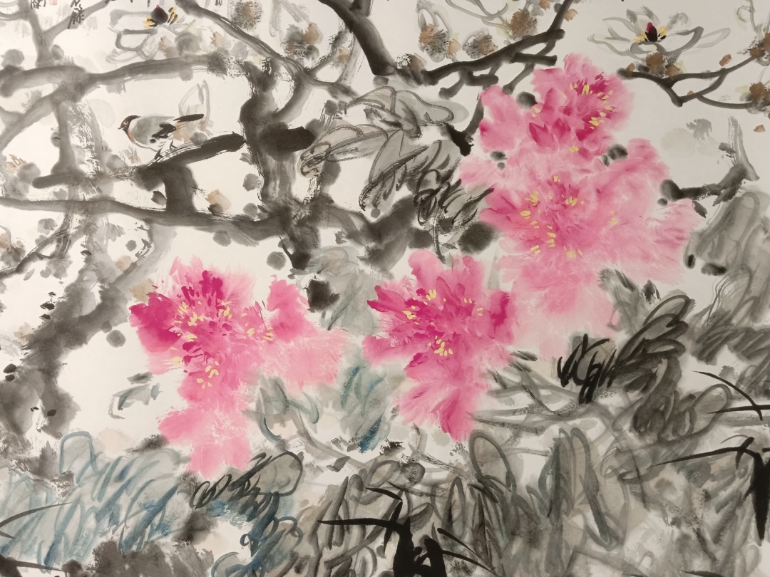 陈永锵先生所绘牡丹,依然采用没骨手法,花瓣采用胭脂、洋红层层晕染,由深至浅过渡自然,边缘晕染出朦胧质感,凸显牡丹“雍容华贵”姿态;花蕊以明黄点出,醒目提神,与粉色花瓣形成鲜明对比。禽鸟则以简练的写意笔法勾勒,墨色浓淡呈现羽毛层次,姿态静中含动,栖于枝头顾盼有神,为画面注入灵动生气!老干以浓墨枯笔写出,苍劲虬曲,岁月质感立现;叶片以淡墨、花青、赭石晕染,线条奔放洒脱,画面下方以蓝墨、焦墨勾勒兰草与杂叶,线条飘逸舒展,既丰富了画面层次,又暗合了文人画“清雅脱俗”的审美意趣并融入了“刚劲清雅”的艺术品格,使得作品于富贵之外更具风骨矣!可以这样说,此牡丹图式可谓是现代大写意花鸟典型代表,在红与黑的强烈对比中,既保留了牡丹的热烈奔放,又以酣畅笔墨呈现出洒脱的内美风骨,风格且介于吴昌硕的雄浑与王雪涛的灵动之间,不激不厉,风规自远!