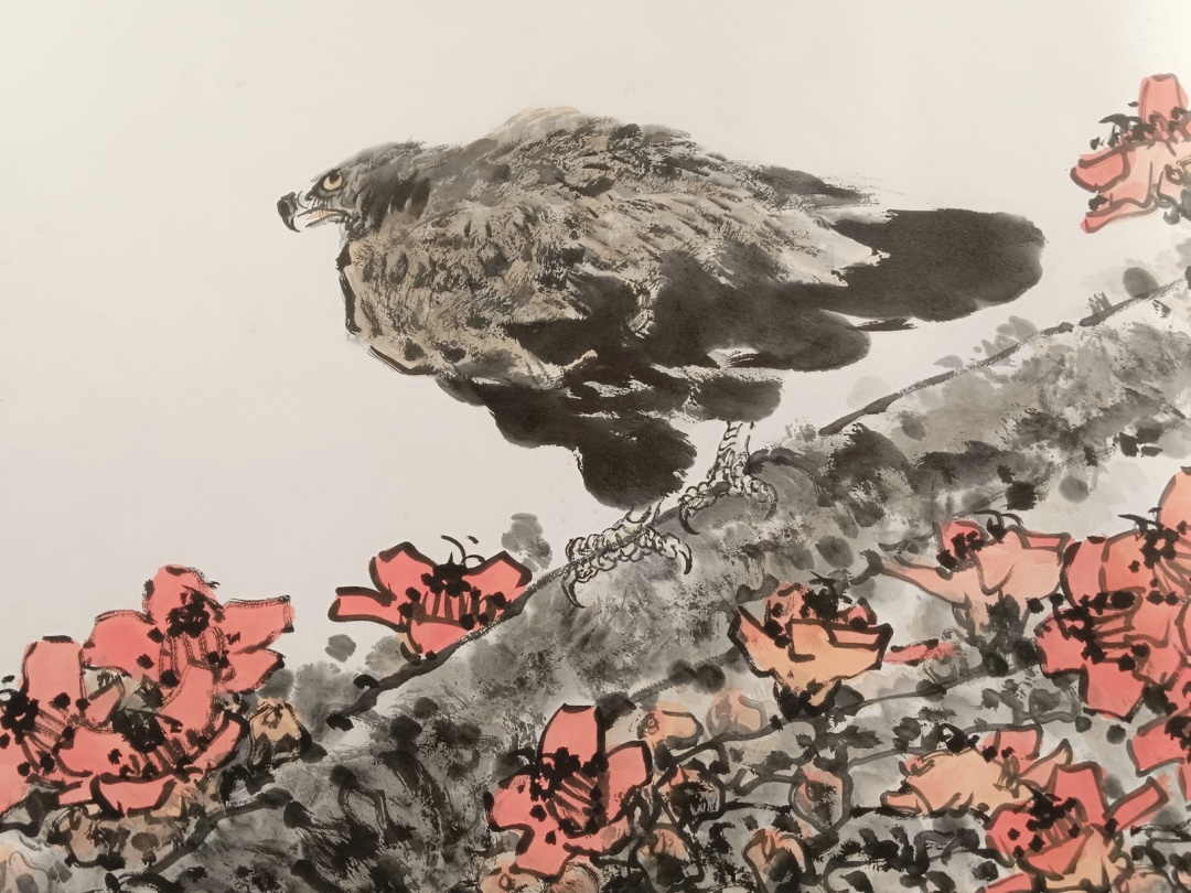 苍鹰以大写意笔法刻绘,羽毛以浓淡枯湿的墨色层层皴擦,表现出羽毛的蓬松质感与力量感;鹰爪以劲挺的线条勾勒,尖锐有力,紧扣枝干,猛禽的威严与警觉显露无疑;眼神锐利,喙部刚硬,呈现出“厚积薄发,鹰击长空”的雄姿!画面中的木棉花以浓艳的朱红、橙红点染而成,花瓣以简洁的块面表现,墨线勾勒轮廓与花蕊,色彩浓烈如火,象征着“英雄花”的刚烈与热血;木棉枝干以焦墨枯笔皴擦,苍劲嶙峋,与鹰的力量感形成呼应。整体来说,苍鹰居于画面视觉中心,木棉环绕铺陈,留白简洁,突出主体的威严感;动静结合,鹰的静穆与木棉的热烈形成对比,强化气韵与力量,体现了中国画“重神轻形”的艺术特征,朱红的木棉与浓墨的鹰、枝干形成鲜明对比,视觉冲击力极强,既热烈又庄重,通过墨色的干湿变化与线条的顿挫,散发出生命的力量与韵律!
