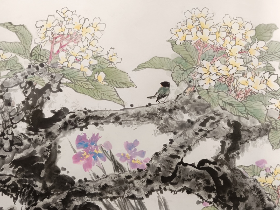 鸡蛋花卉,以双勾填色法勾勒花瓣,白瓣黄心的特征清晰还原,花瓣边缘以淡墨线勾勒,明黄点染花心,清新明快;叶片以淡绿色晕染,墨线勾勒叶脉,形态舒展,与柔美的花朵形成呼应。画中禽鸟头部浓墨点染,背部青灰晕染,腹部留白,姿态静中含动,栖于枝干回首顾盼,灵动生气至极!下方点缀紫色鸢尾类花卉,以淡紫、蓝粉色点染花瓣,明黄点蕊,色彩艳而不俗,画面层次丰盈。白、黄、绿、紫的淡雅搭配,冷暖对比和谐,色调清新明快,疏密错落,动静相宜,绘就出了“鸟语花香”的自然场景!