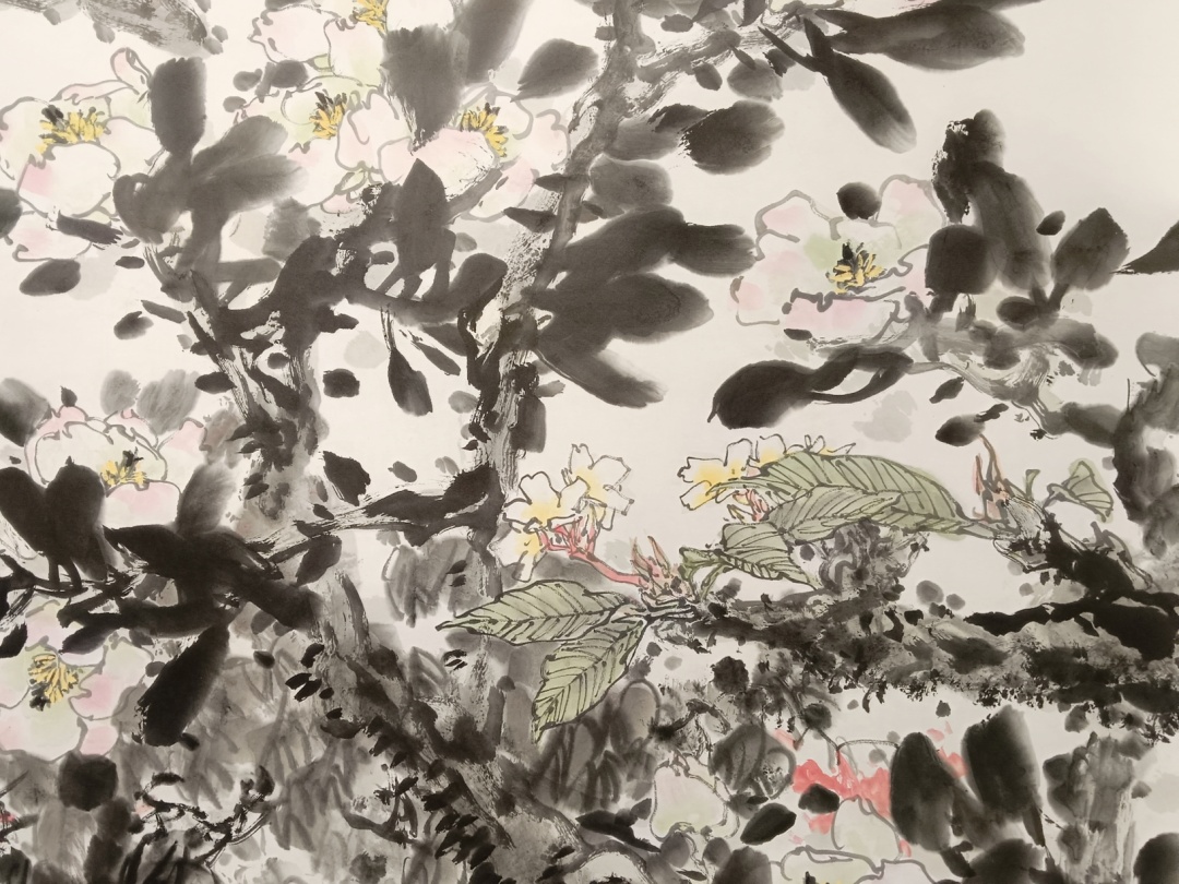 此《芳心不老》花鸟长卷以水墨梅花为引首。毫无疑问,墨梅,可视为典型的中国写意花鸟画题材,陈永锵先生笔下梅花尽显风骨与清雅!画面中,其以浓墨、焦墨勾勒老干,笔触苍劲顿挫,尽显虬曲嶙峋的质感;新枝则以流畅的中锋行笔,挺拔舒展,凸显出“瘦劲如铁”的梅枝特质。梅花部位则采用双勾圈花法,以淡墨勾勒花瓣轮廓,浓墨点出花蕊,虚实相生,灵动自然;花朵疏密错落,长枝处疏、短枝处密,极富韵律感。淡墨晕染,浓墨丰神,浓淡干湿的墨色变化丰富,留白处更显梅花的清润皎洁,营造出了“疏影横斜”的诗意空间!且看梅枝纵横穿插,由右下向左上延伸,形成富有张力的动势,繁而不乱,主次分明,充分体现了中国画“计白当黑”的美学原则!孰人不知,梅花是中国传统梅、兰、竹、菊四君子之魁首,陈永锵先生先生抒心中块垒于毫端,以梅喻人,体现出其淡泊名利、清正超逸的文人情怀!