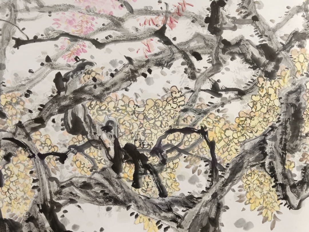 画面中的金黄果实,暖黄、橙黄层层晕染,墨线勾勒轮廓,簇簇垂挂,饱满圆润,既呈现果实的丰硕感,又流透出秋日成熟的暖意。以淡粉、洋红晕染,墨线轻勾花卉,点缀于枝干高处,为画面注入柔媚生机,打破了秋实的厚重感,苍劲老干与柔媚繁花、丰硕果实形成对比,暗合“历经沧桑仍生机勃发”的人生哲理,体现出“老而弥坚”的生命品格。暖黄果实与粉红花簇、浓墨枝干形成鲜明冷暖对比,视觉冲击力强而不失雅致。枝干纵横交错,果实与繁花簇拥铺陈,留白极少,营造出“枝繁叶茂、硕果累累”的繁盛感,充盈着生命的张力!陈永锵先生将苍劲老干、丰硕秋实与柔媚繁花融合,在厚重中注入灵动,呈现出秋日丰饶,生机永续的自然意趣!