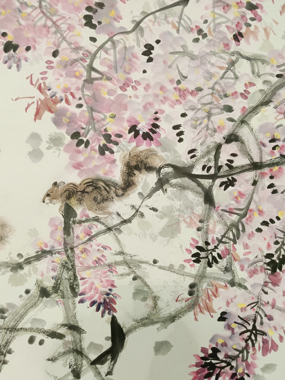 在以“松鼠、粉红花簇、苍劲枝干”为主的图式中,松鼠灵动俏皮,刻画细腻传神,其动态活泼与繁花、枝干的静态沉稳形成对比,让画面充满节奏感与生命力。此图式兼工带写,在细腻刻画松鼠的同时,以暖色调繁花烘托春日野趣,生活气息浓郁。这与刘继卣先生极具写实的细节刻画,对生灵形态的精准还原显然不同。