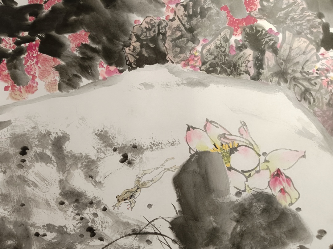 盛夏时节的荷塘里,荷花边缘墨线轻勾,莲蓬石绿点染、明黄花蕊醒目,娇柔雅致,以浓淡墨泼洒皴擦,形态嶙峋厚重,水面以淡墨扫笔表现,墨点点缀出涟漪质感,青蛙姿态舒展、神态自若,为静谧荷塘注入鲜活生命力,红果与粉花簇拥,色彩浓烈;荷叶以浓墨泼洒,墨色干湿浓淡层次丰富,呈现夏日丰饶气息。画面取材于荷塘一隅,不事雕琢,青蛙、荷花刻画细腻,荷叶、墨石以大写意泼墨表现,从焦墨皴擦荷叶到淡墨,清雅粉荷与浓烈秋实、浓墨荷叶形成冷暖,呈现出夏日荷塘的独特韵美!