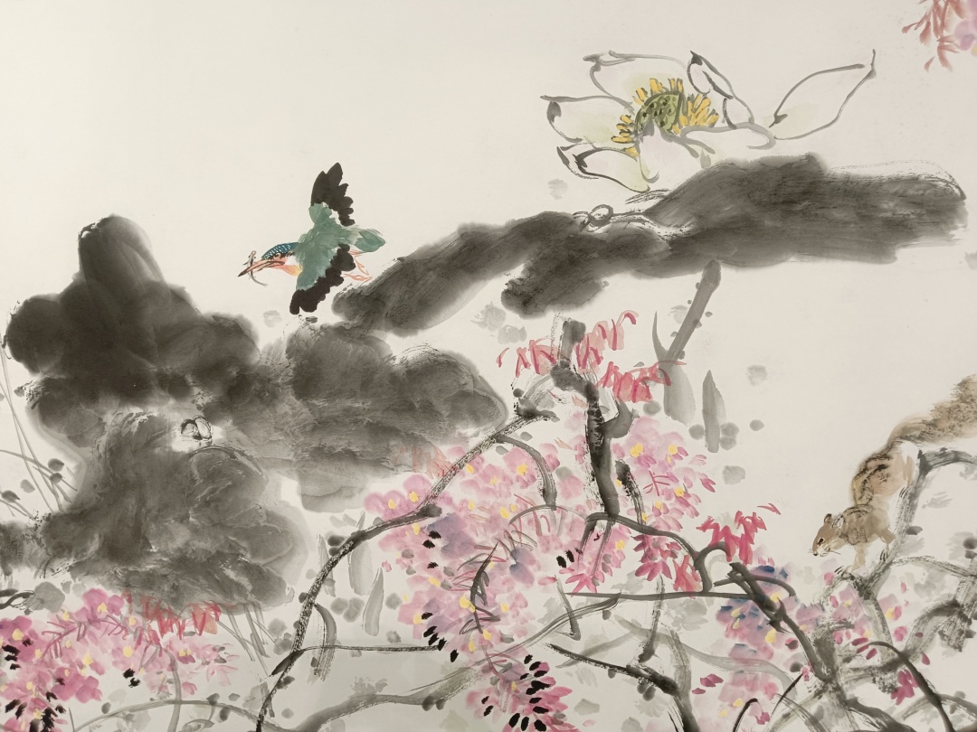 陈永锵先生在此幅花鸟画长卷中,将“翠鸟、荷花、紫藤、松鼠、墨石”等题材巧妙融合,羽毛以石青、橘红、墨色层层晕染,细节精致,喙部叼着小鱼,姿态俯冲欲落,荷花则以双勾填色法表现,花瓣以淡白、浅绿晕染,墨线勾勒轮廓,莲蓬以石绿点染,明黄花蕊醒目,清雅高洁,紫藤则以淡粉、洋红层层晕染,明黄点蕊,墨色勾萼,成串垂挂,娇柔饱满;红色嫩叶与墨色枝干交错,呈现出一派春日繁盛景象!翠鸟捕鱼、松鼠探枝、繁花盛放、荷花初绽,画面取材于自然生灵,不事雕琢,翠鸟的俯冲动态与松鼠、花枝的静态形成对比,画面清新明快,春光无限!