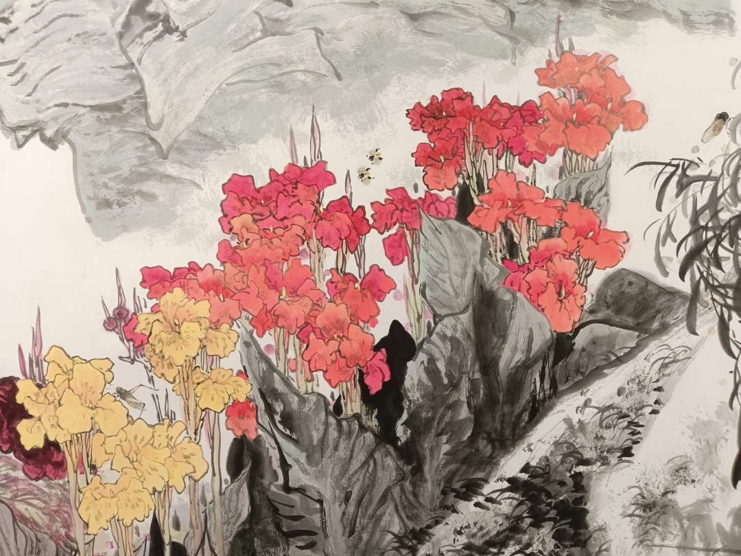 画面中的美人蕉以朱红、明黄层层晕染,花瓣形态舒展饱满,叶脉以浓墨勾勒,质感厚重;红、黄两色花簇交错排布,视觉冲击力极强,彰显着夏日花卉的热烈生命力!以淡墨、花青皴染山石,纹理苍劲嶙峋;上方山石以浅墨勾勒,层次分明,蜜蜂姿态灵动、细节精致,蝉翼通透轻盈,可视为静态花卉与山石点睛之笔。右侧柳叶以枯笔撇出,飘逸灵动;下方草叶以细墨线勾勒,增添山野自然意趣。此图式色彩对比强烈:朱红、明黄花卉与浓墨枝叶、淡墨山石形成鲜明冷暖对比,视觉张力十足。构图疏密有致:花簇密集铺陈,山石与留白穿插,既显繁盛热烈却又不失通透空灵,我想,岭南画派以“撞水撞粉”技法见长,更侧重花卉的细腻质感与清雅意趣表达的居廉先生倘若得见亦会激赏不已的!