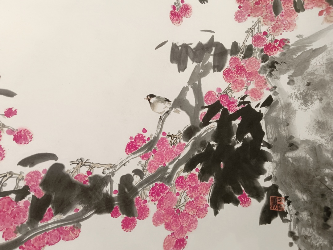 陈永锵先生在细腻刻画荔枝与鸣禽的同时,以浓墨枝叶烘托丰饶意趣,风格温润雅致,这显然与以简练奔放的笔墨与明快艳丽的色彩著称的赵少昂先生是不同的!