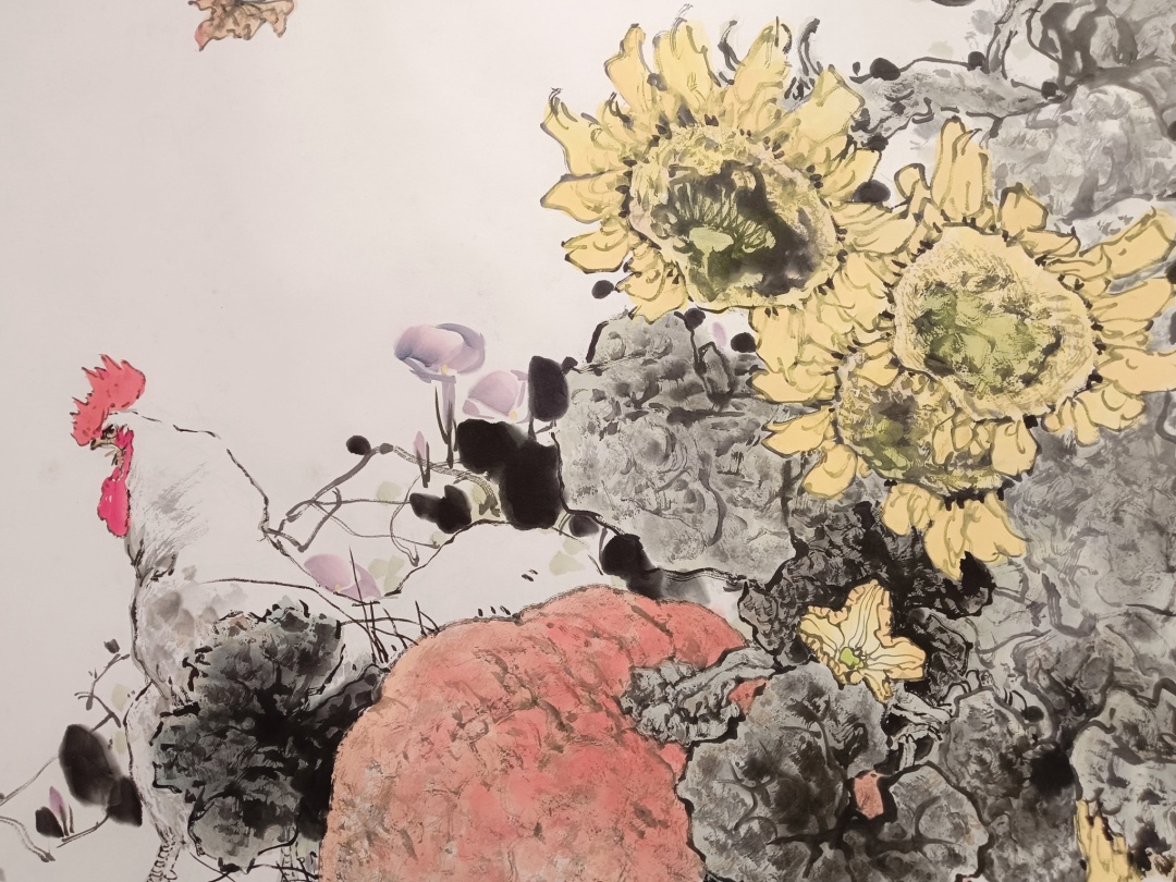 雄鸡之身,以淡墨晕染,红冠、红喙以浓朱砂点染,墨线勾勒羽毛肌理,姿态昂首挺立,生动呈现出其英气与灵动!向日葵以明黄花瓣层层晕染,花盘以石青、墨色勾点,形态饱满向阳,象征“向阳而生、欣欣向荣”,与白鸡形成动静呼应。以朱红、赭石没骨泼染的金瓜,表皮纹理以枯笔勾勒,形态圆硕饱满,寓意“丰收富足、圆满吉祥”,以浓墨、焦墨皴染山石,纹理苍劲嶙峋;紫色草花、瓜叶以淡彩点染,穿插其间,平衡画面色彩,增添自然野趣。