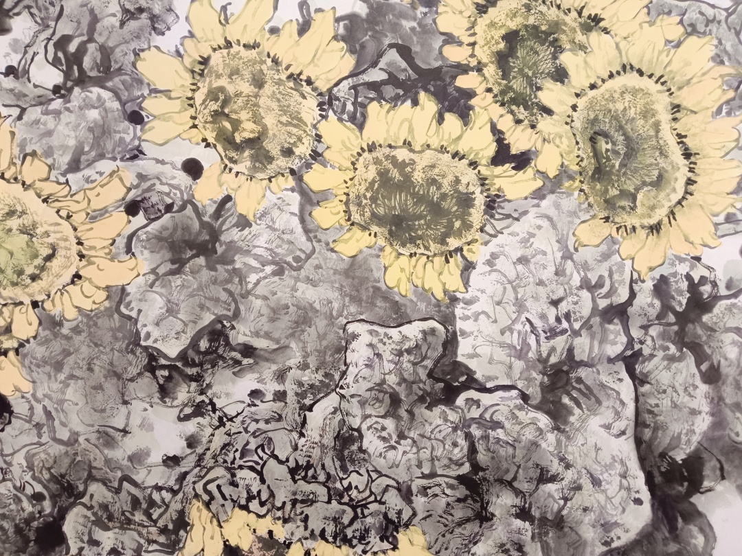 陈永锵先生画向日葵亦可为一绝。其形态舒展向阳;花盘以赭石、石青、墨色层层皴染,籽实以浓墨点出,质感厚重饱满,以浓墨、焦墨、淡墨层层皴擦,使得湖石纹理苍劲嶙峋,线条顿挫老辣,向日葵的明快色彩与湖石的浓淡墨色相互映衬,墨色干湿并用,既显通透质感,亦不失其苍劲风骨,彰显出“向阳而生、坚韧不屈”的东方哲思,它与西方后印象派的梵高拉开了很大的距离,梵高是以浓烈色彩与粗犷笔触宣泄生命激情,对阳光与生命力,梵高是极致赞美的,其风格更是热烈奔放的!