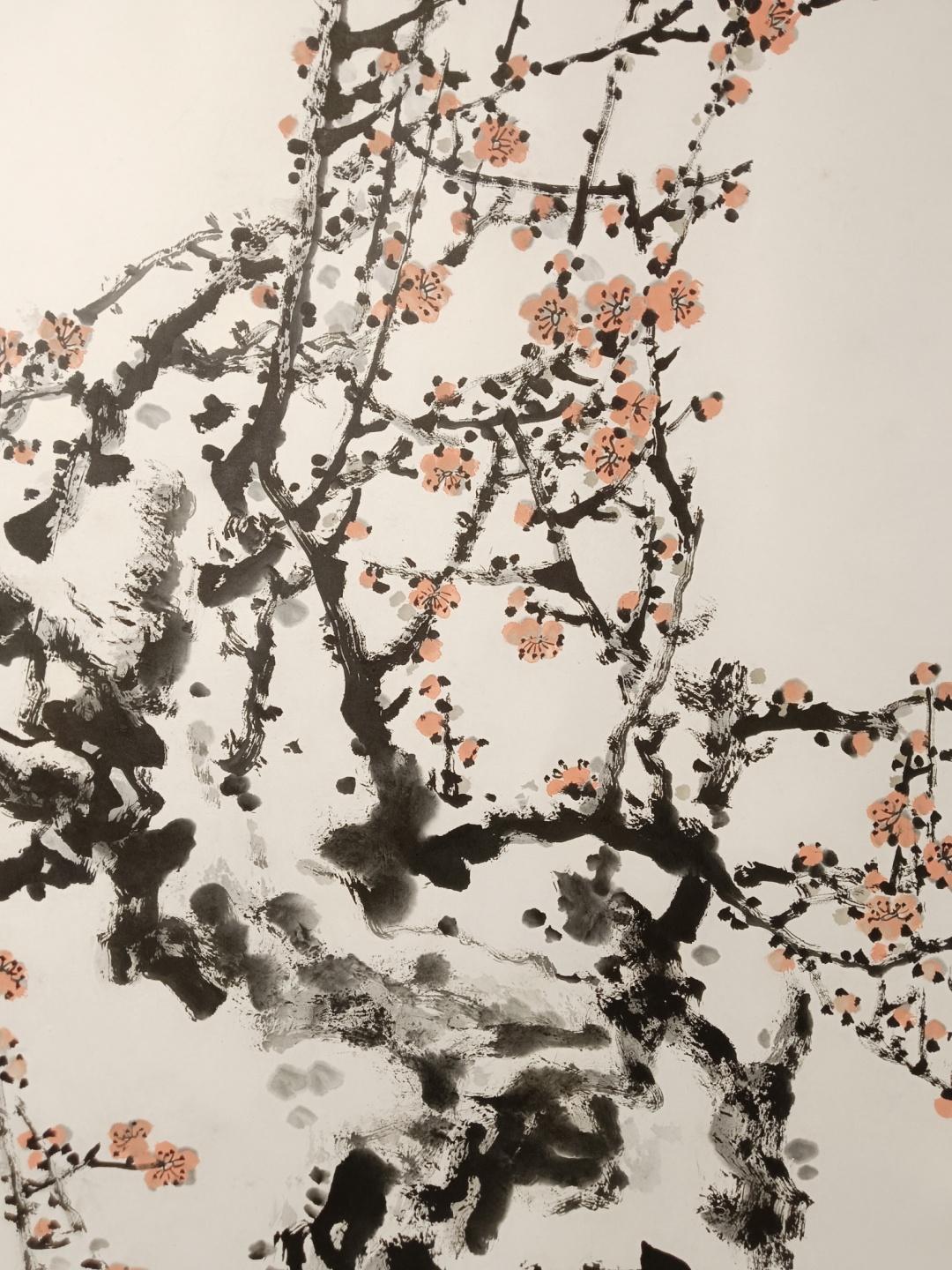 在陈永锵先生的红梅图式里,花蕊则是以浓墨细点,疏密错落,在留白背景中格外醒目,以凸显其“凌寒独自开”的铮铮铁骨!墨色干湿并用,浓淡交错,既显枝干的厚重苍劲,又留足空白,让梅花的风神更具张力!极简的墨色与明艳红梅,营造出“疏影暗香传清韵、钟灵玉露显精神”的清雅意境!枝干交错穿插,梅花疏密有致,大量留白让画面呼吸感十足,让我们领见到东方美学的“留白意境”!