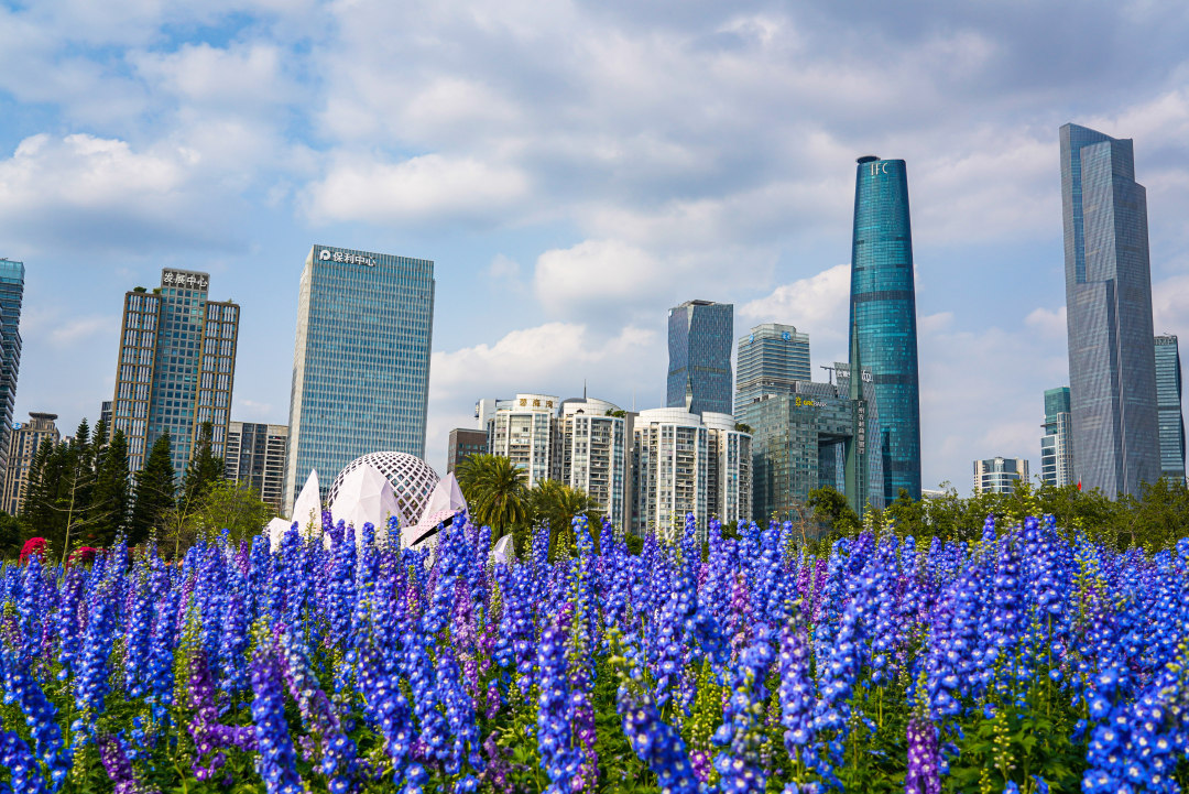 二沙岛宏城公园,飞燕草开成蓝紫色的花海,与远处的珠江新城相映成趣。