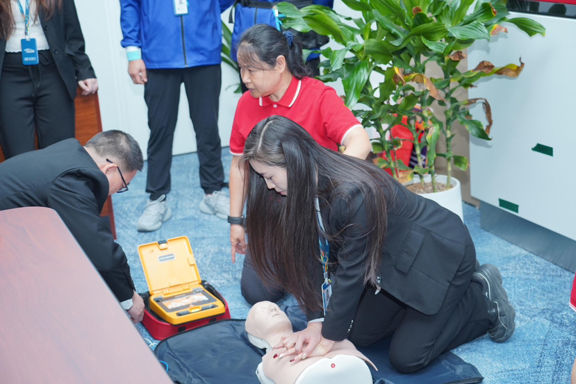仪式结束后,来自蓝态公益基金会的专业志愿者团队立即为在场的工作人员开展了AED使用及急救技能培训。培训师通过理论讲解与实操演示相结合的方式,详细介绍了AED的操作步骤、注意事项以及心肺复苏等应急救护知识,切实提升一线员工的现场急救能力,确保设备在关键时刻能“用得上、用得准”。