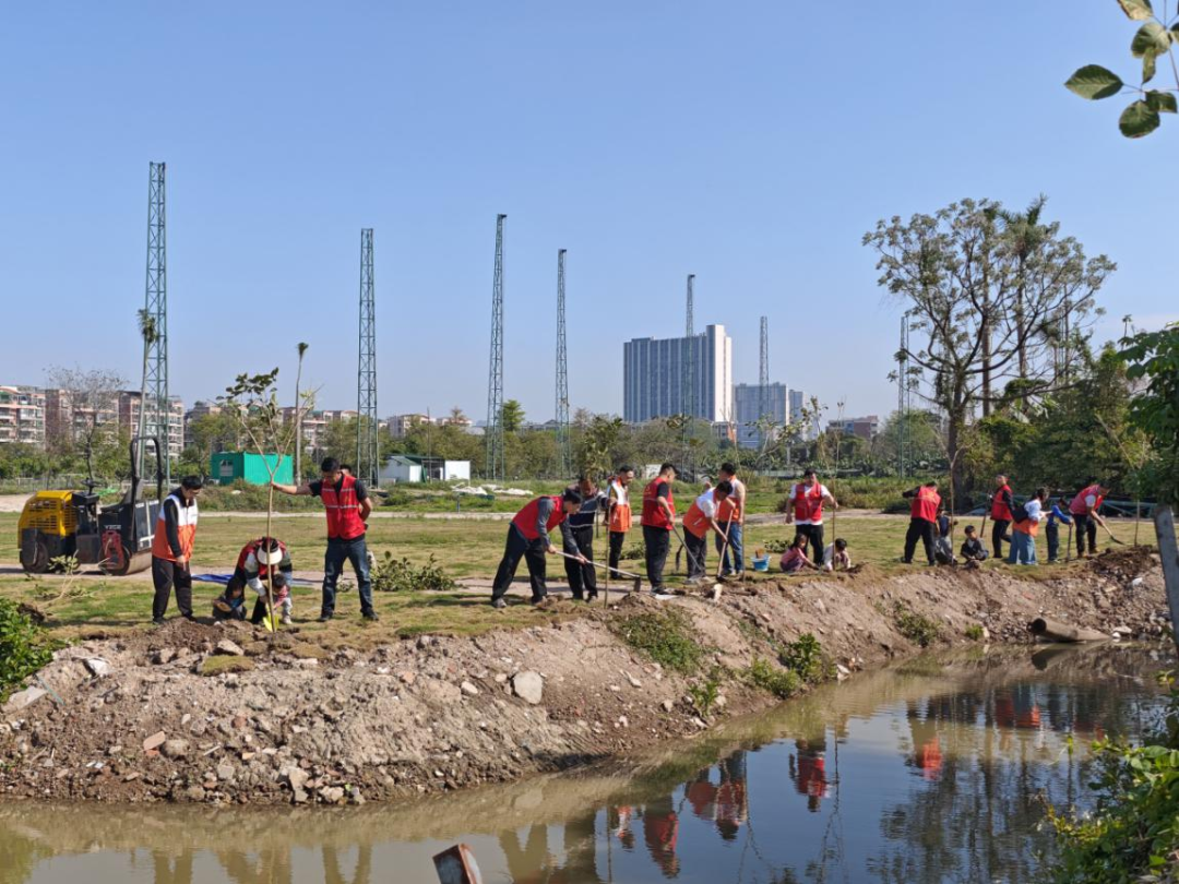 3月14日9时30分,线下与共建单位广州市番禺水务投资集团有限公司联同植树活动在中万益如期举行。活动现场,专业人员先进行示范教学,讲解挖坑深度、树苗扶正、填土压实等关键步骤;随后,党员群众分组协作,干劲十足,不一会儿,一排排新栽的树苗迎风挺立,嫩绿的枝叶与蓝天白云相映成趣。