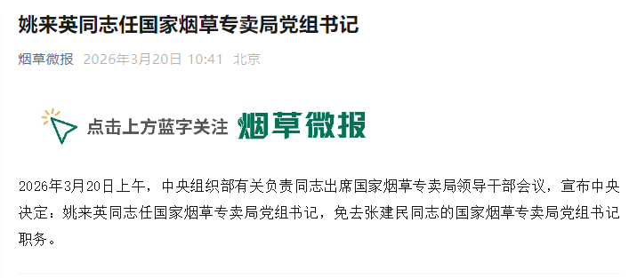 2026年3月20日上午,中央组织部有关负责同志出席国家烟草专卖局领导干部会议,宣布中央决定:姚来英同志任国家烟草专卖局党组书记,免去张建民同志的国家烟草专卖局党组书记职务。