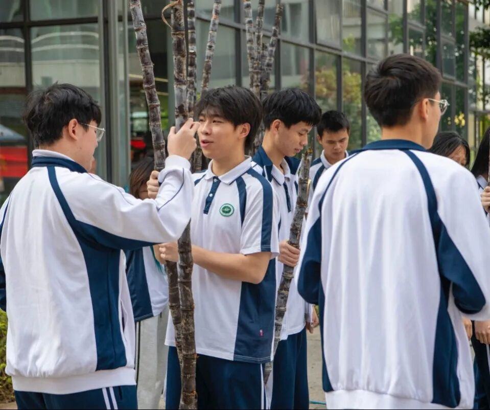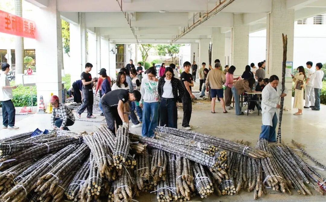 一根根比人高、比手臂粗、乌黑发亮的果蔗,成捆成车地涌进大学校园。在宿舍楼下、饭堂门口、广场空地,师生们扛着甘蔗喜笑颜开,排长龙切蔗、削皮,场面堪比年货大采购。