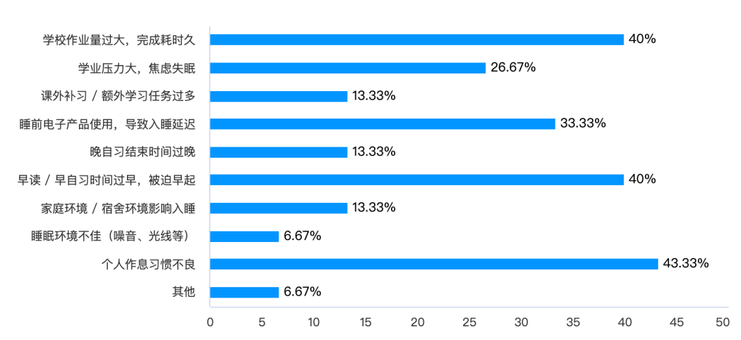 本次问卷调查中,在“导致睡眠时间不足的主要原因”这一问题上,约四成受访者选择了“学校作业量过多,完成耗时久”“早读/早自习时间过早”“个人作息习惯不良”。