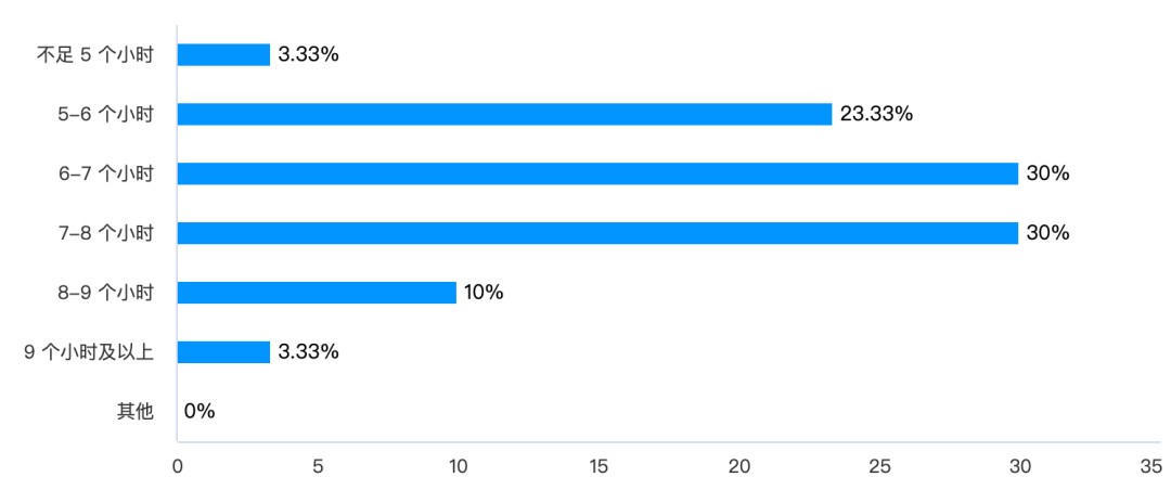 本次问卷调查中,针对“上学日(周一至周五),平均每晚的实际睡眠时长是多少”这一问题,超五成的受访中学生表示每晚睡五到七个小时。
