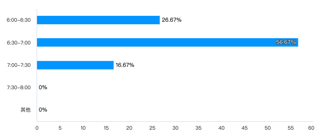 本次问卷调查中,受访中学生在上学日通常的起床时间,集中在六点半至七点。