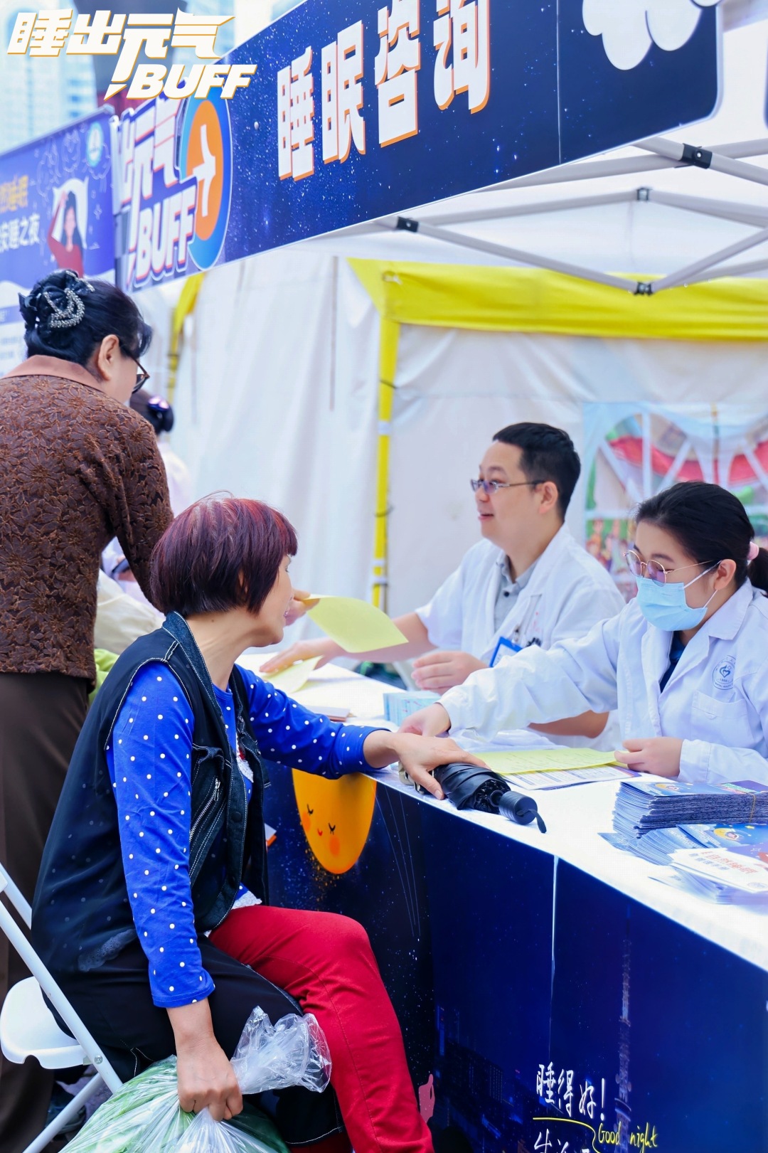上午10时左右,各摊位就排起长队。睡眠知识科普区里,医院中医与睡眠医学科专家现场坐诊,免费提供贴耳穴、睡眠评估、压力型失眠调理等个性化指导。