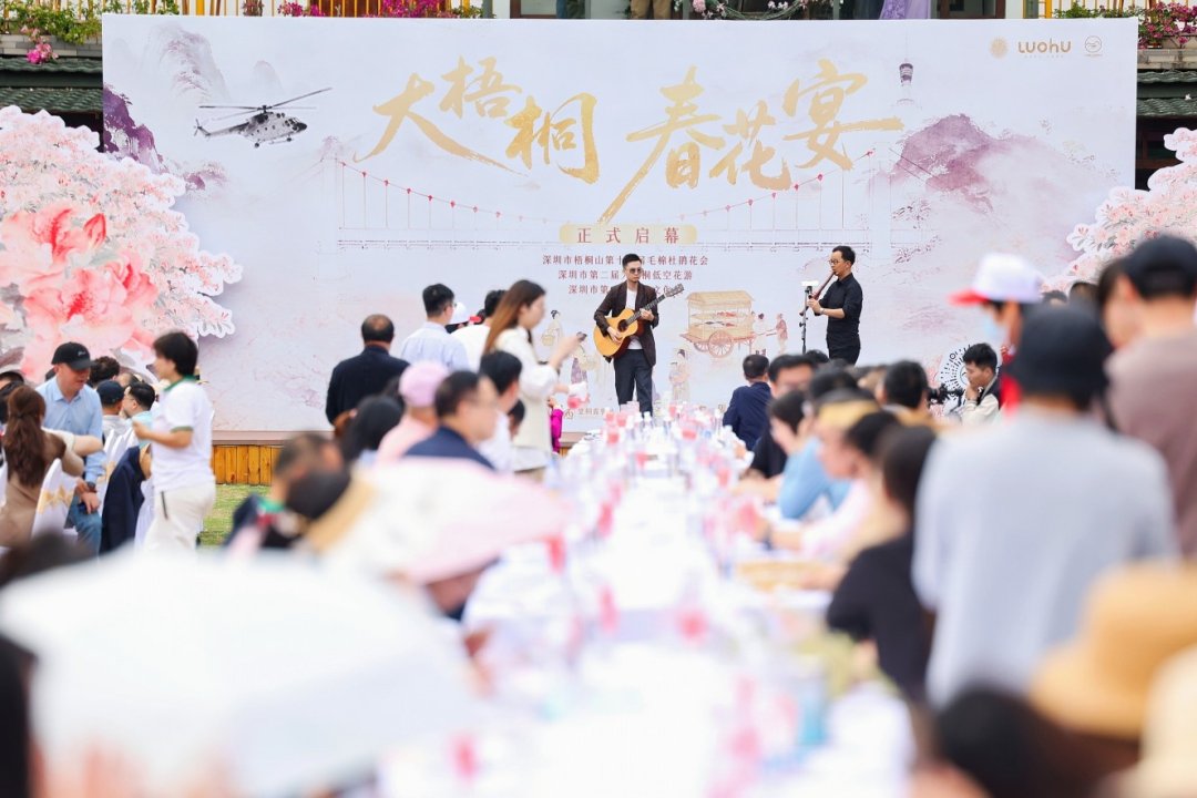 步入梧桐山河碧道,宫粉紫荆沿河盛放,与远处梧桐山上的毛棉杜鹃遥相呼应。碧道一侧,“梧桐健康饮食街”与“梧桐艺术文化街”热闹开市,素食市集上,精致的素食点心、创意素食引人驻足;沿河而行,民乐悠扬,古风舞蹈翩然上演,宋韵巡游队伍穿行其间,为春日山野增添了几分古雅意趣……3月20日,深圳市首届大梧桐春花宴在罗湖区望桐露营地、梧桐山河碧道诗意开幕。本次活动以花为媒、以素会友,推出千人素食长桌宴开席、直升机低空花游云端赏花、碧道露营、春日市集、文化展演等一站式打卡活动,打造沉浸式春日文旅盛宴。