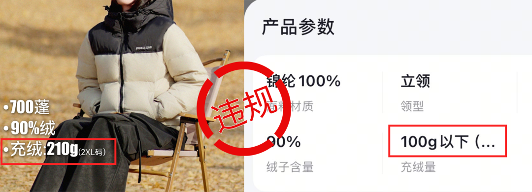 部分商家在售卖羽绒服时,宣传主图上描述2XL码的羽绒服充绒量210g,但实际上商品属性充绒量为100g以下。上述行为涉嫌虚假宣传规格,平台已根据相关条例,对相关商家进行处置。