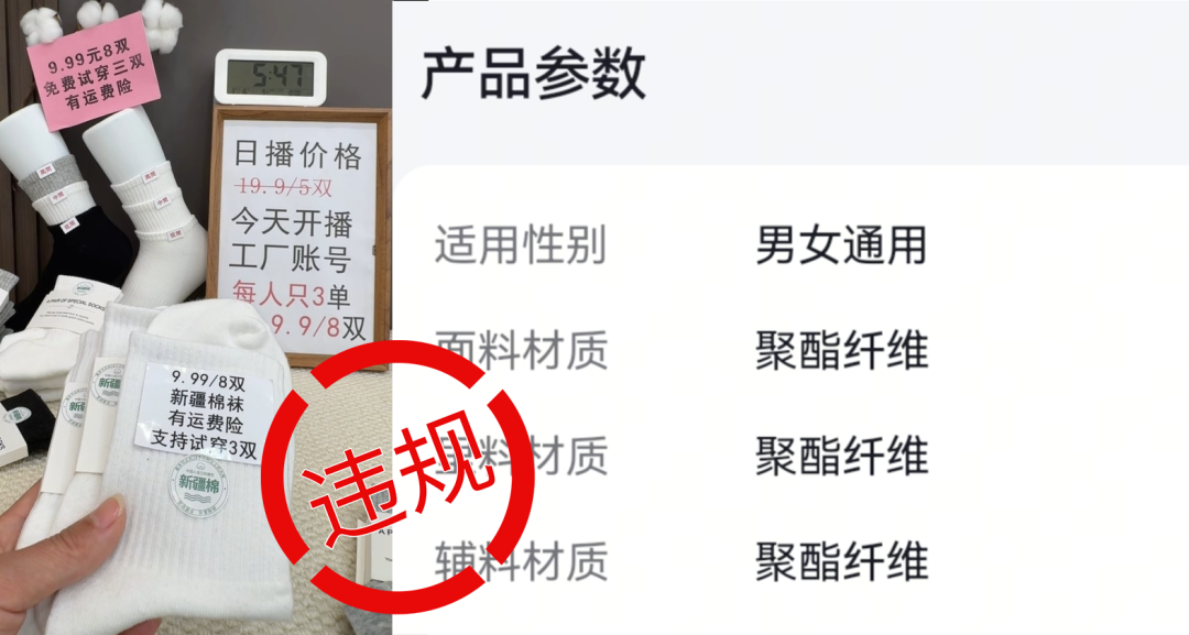 部分主播在直播间宣传商品为棉材质,实际挂车商品“面料材质”的参数却为“聚酯纤维”;或主播在口播时宣传纯棉,实际挂车商品“面料材质”参数为“默认面料材质100%”,未体现具体材质。上述行为涉嫌虚假宣传规格,平台已根据相关条例,对相关达人进行处置。