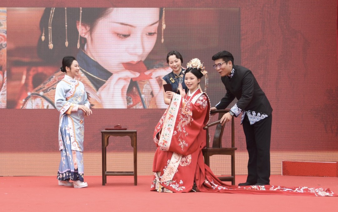 活动当天,百花台主会场内外喜气洋洋,婚俗文化墙与糖果展区前早早聚满了观展人群。二十四节令鼓擂响铿锵鼓点,英歌舞气势开场,现场氛围瞬间点燃。伴随着潮州婚俗宣传片的播放,古城风韵、非遗匠心与浪漫婚俗逐一铺展。随后上演的传统婚俗情景演绎更是引人入胜:新郎肩挑春盛礼担缓步而来,十二版帖定下婚约;新娘挽面、梳妆、点红唇,出阁礼步步考究。分米钱环节,新人将五谷与钱币装入红袋,寓意“五谷丰登、家业兴旺”,引得现场观众争相接福,掌声不断。