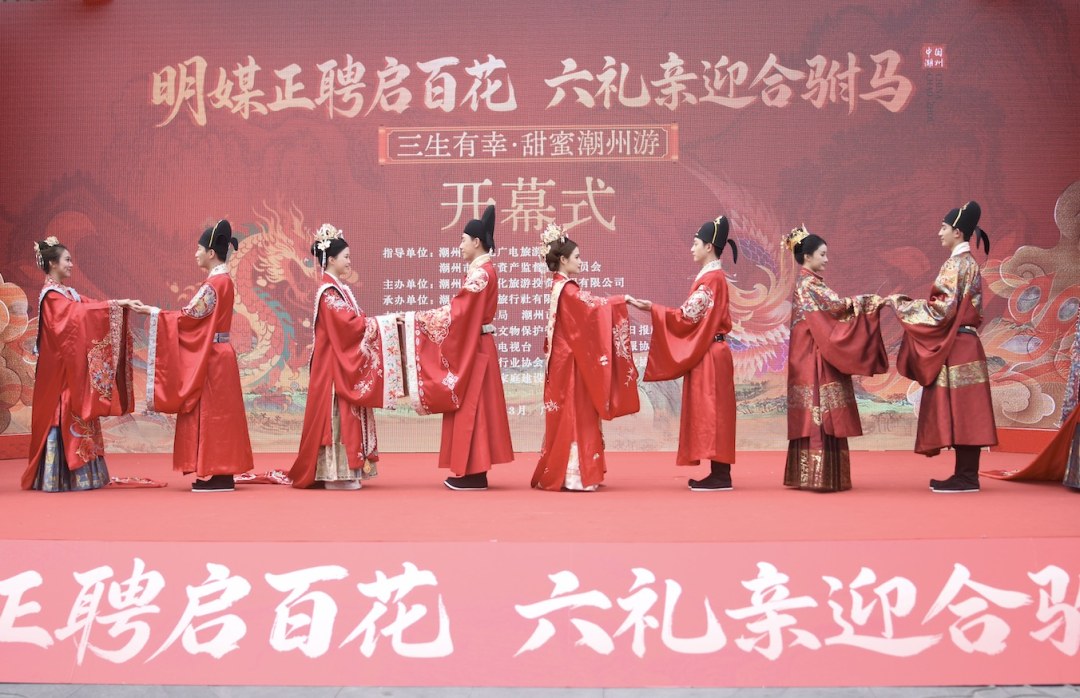 良辰吉时到,佳偶天成时;三书六礼备,缘定潮州城。3月21日,以“明媒正聘启百花 六礼亲迎合驸马”为主题的“三生有幸·甜蜜潮州游”活动,在潮州百花台民俗综合体热闹启动。一场将千年婚俗文化与文旅产业深度融合的盛会,为市民和游客奉上一道沉浸式文化大餐,也标志着潮州文旅正式迈入“文化+甜蜜”的新赛道,向四海宾朋发出“甜蜜之约”。