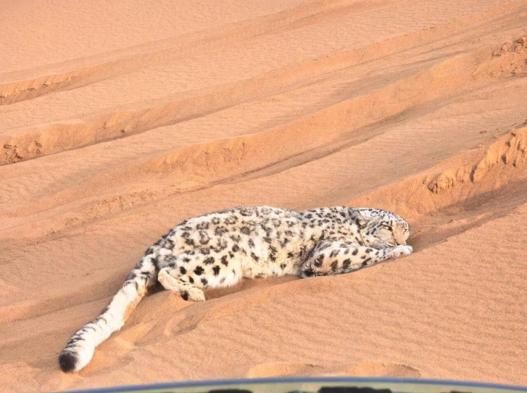 当日14时许,鄯善县公安局环境资源和食品药品犯罪侦查大队接到群众紧急报警,称在库木塔格沙漠海市蜃楼景点向沙漠纵深30公里处发现一只雪豹,疑似因误入沙漠陷入困境,急需救助。接警后,警方立即启动应急处置预案,由环食药侦大队牵头,迅速联动辟展派出所、特警大队警力组成救援专班,赶赴现场开展救援。