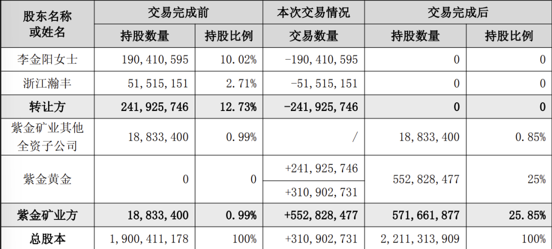 本次交易前,公司其他全资子公司已持有赤峰黄金0.19亿股;本次交易完成后,公司全资子公司合计将持有赤峰黄金5.72亿股,约占其增发完成后总股份数的 25.85%。公司将取得赤峰黄金的控制权,并实现对其财务并表。