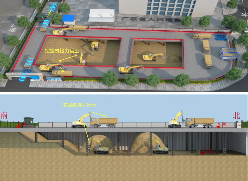 针对土方开挖阶段渣土车无法下基坑的难题,团队创新推出“挖掘机接力垂直出土”工艺,通过挖掘机将土壤层层传递至11米高的栈桥上再装入渣土车,最快2.5分钟即可完成一辆渣土车的装土作业,高峰期夜间出车可达100辆,高效完成土方开挖任务。