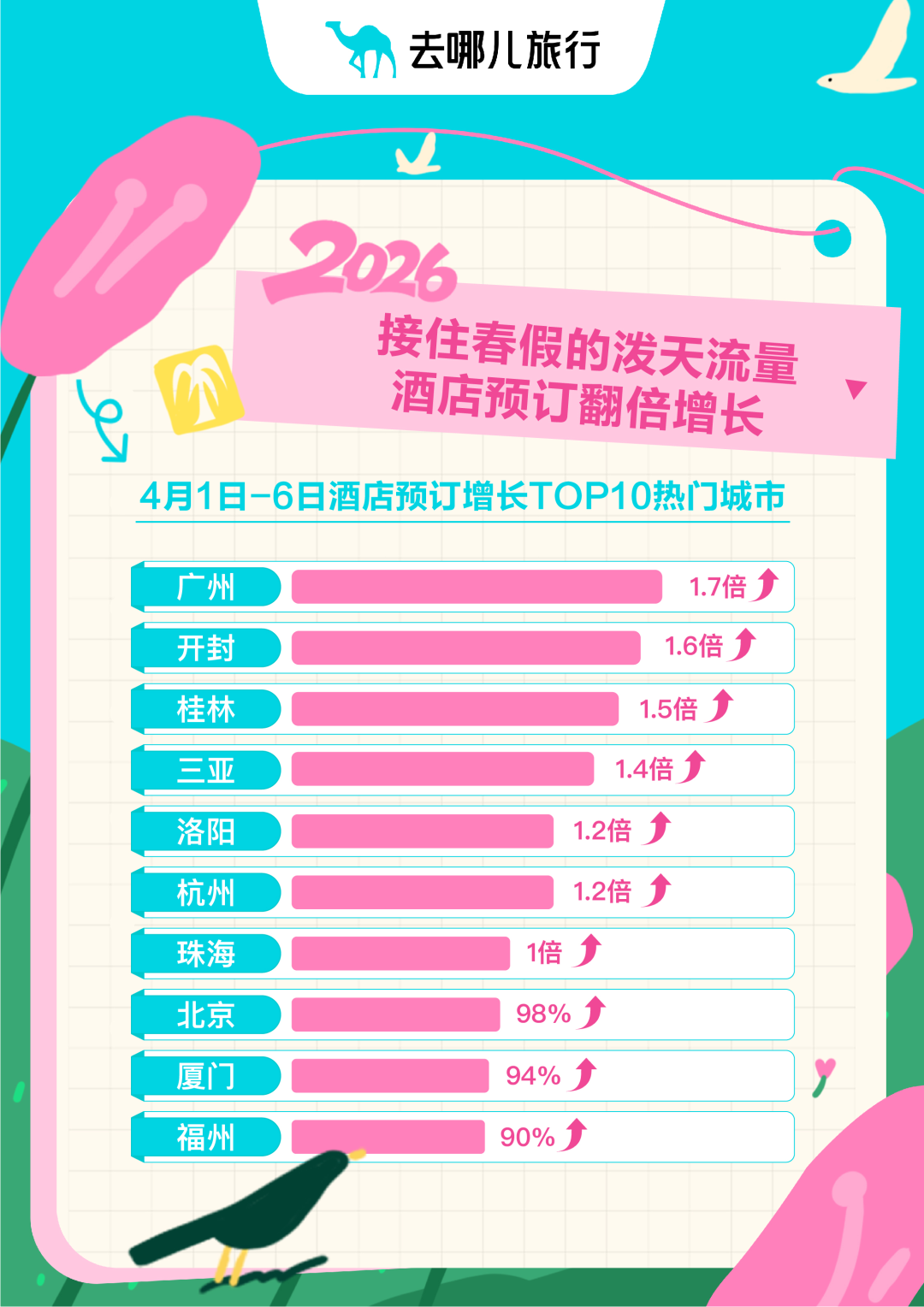 在春假出行的带动下,多座城市酒店预订保持高增速。其中,广州表现尤为亮眼,酒店预订量同比增长1.7倍,洛阳、杭州同比增长1.2倍。此外,同期还有大批港澳市民北上,进一步提升了广州等地酒店的入住率。