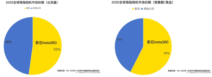 中国品牌影石Insta360继续巩固全球领先地位。IDC数据显示,影石以66%的市占率蝉联全球全景相机榜首,相当于全球每售出3台全景相机,就有2台来自影石。此外,以销售额计,影石在拇指相机市场和广义运动相机市场分别以57%和37%的份额,位居全球第一和第二。