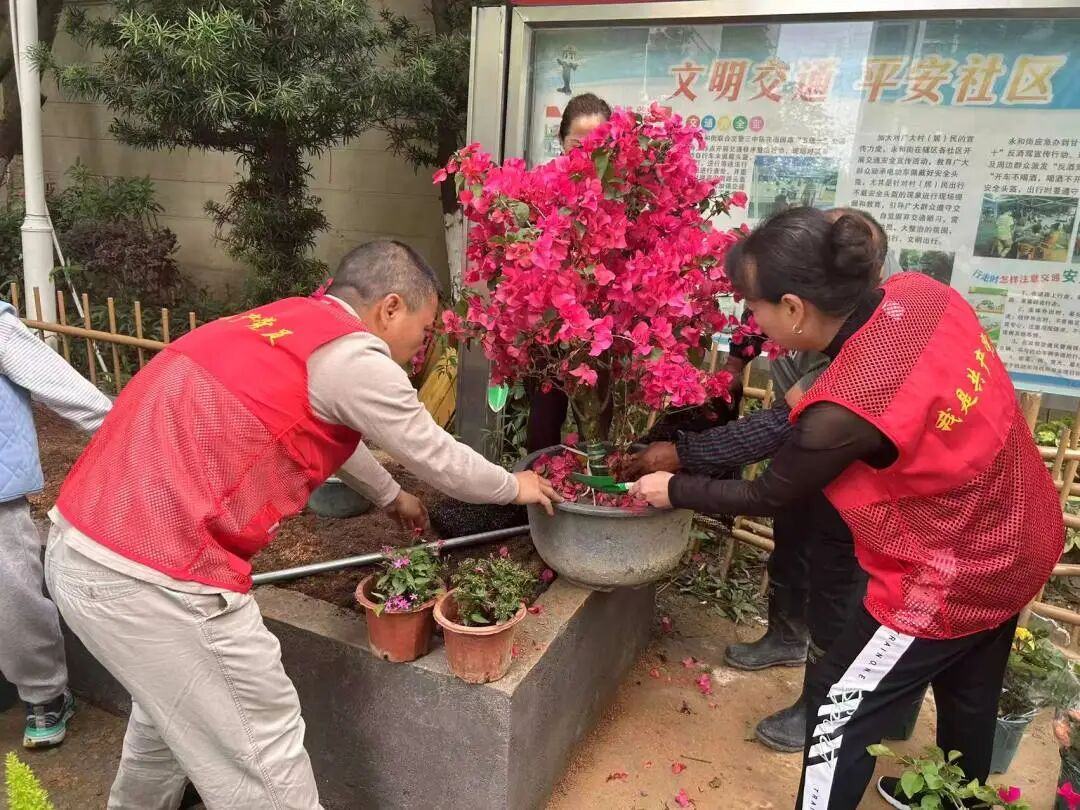 活动现场,党员同志和居民朋友热情高涨,干劲十足,手持铁锹、锄头等工具,迅速投入到劳动中。大家按组分工,配合默契,铲土、填坑、浇水,干得热火朝天。在大家的共同努力下,一株株新栽的花苗迎风挺立,为新增的闲置地块披上了“彩装”,为原有的花池换来了生机和靓丽。