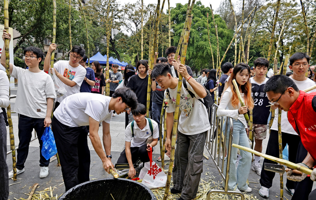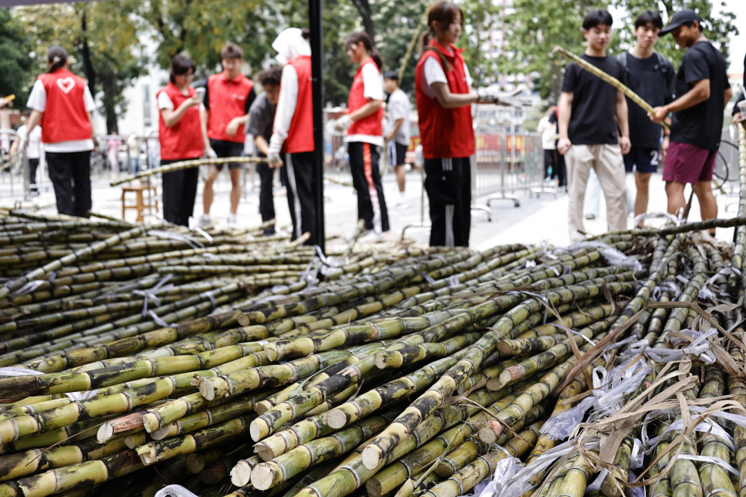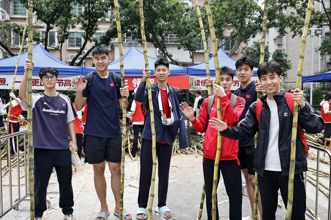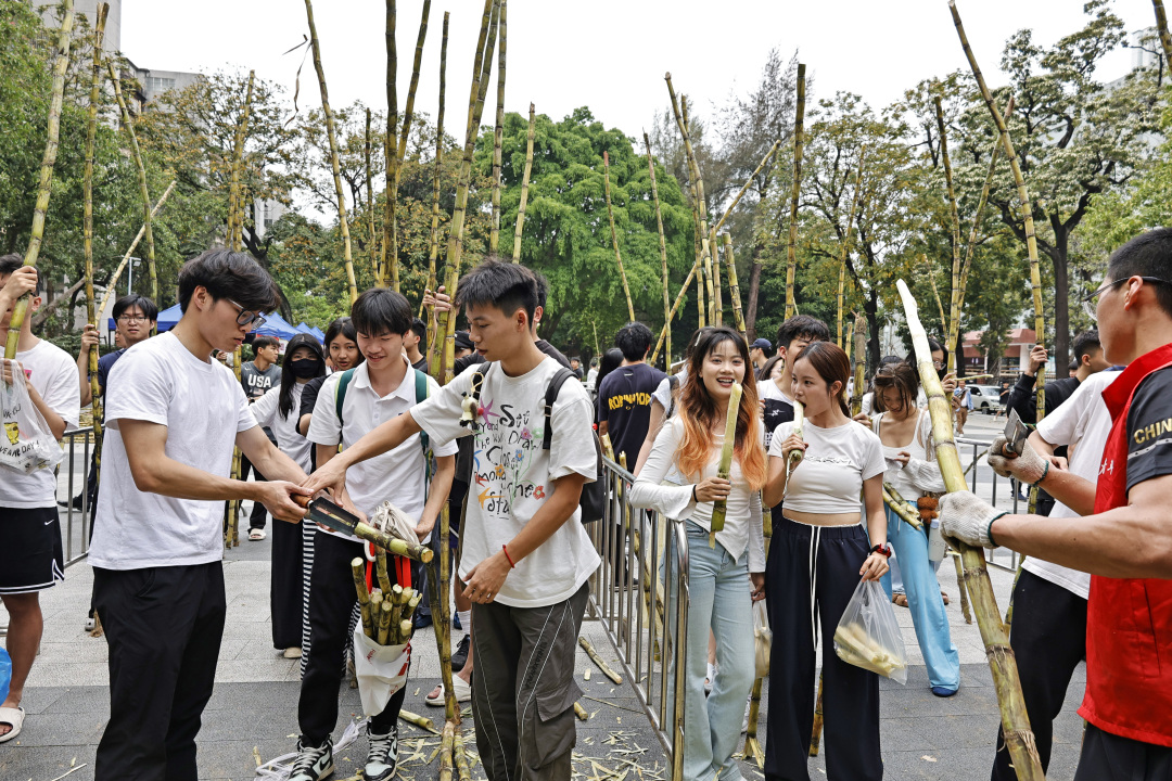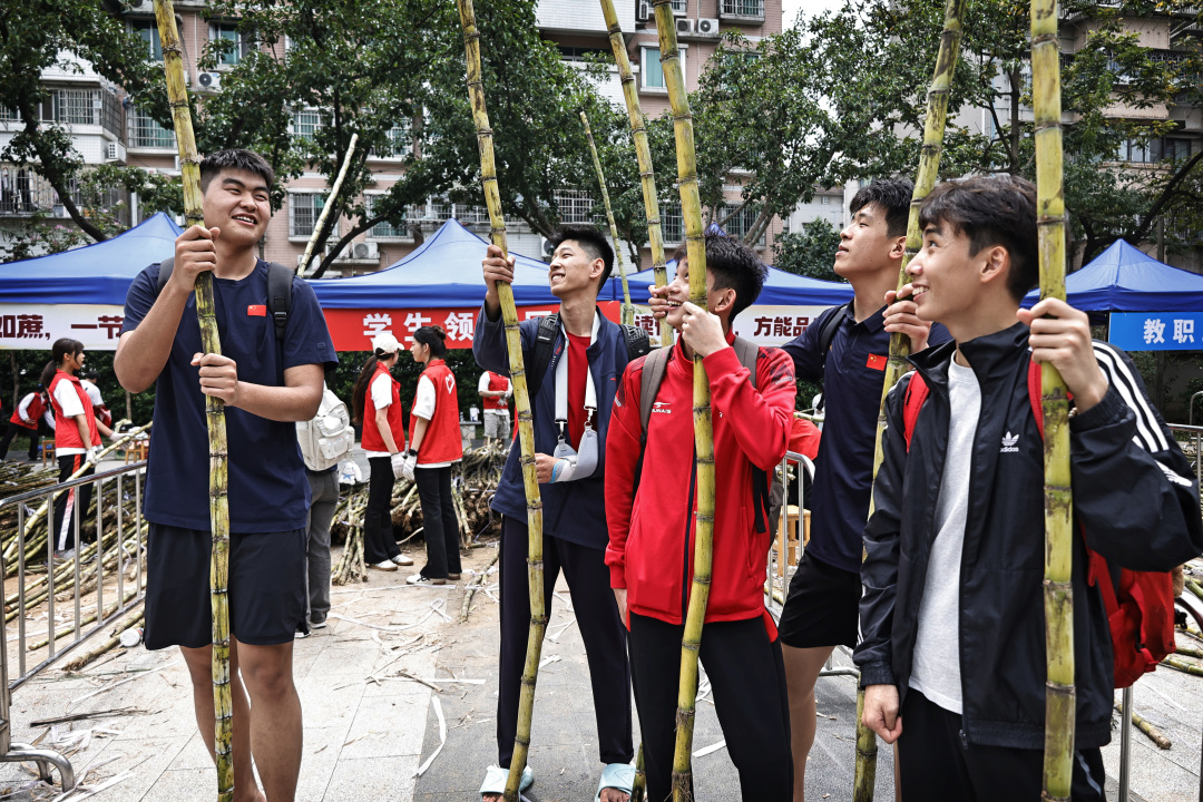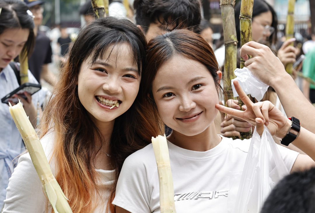 记者在现场看到,迎面走来的一群男生都有两米左右,扛起甘蔗有说有笑,用自己两米的身高丈量起来,显然这蔗足有三米五长!有的学生更是徒手断甘蔗,尽显体育院校特色。每人手握一根甘蔗,乍一看,好似一个个勇猛的壮士;学生们个个满脸堆笑,这新鲜甘甜的甘蔗不仅免费发放,还有志愿者帮忙削好皮。同学们举着甘蔗合影打卡,有的打电话叫同学来“同甘共甜”,有的女大学生面对镜头一边吃一边点赞,笑得甜蜜蜜!