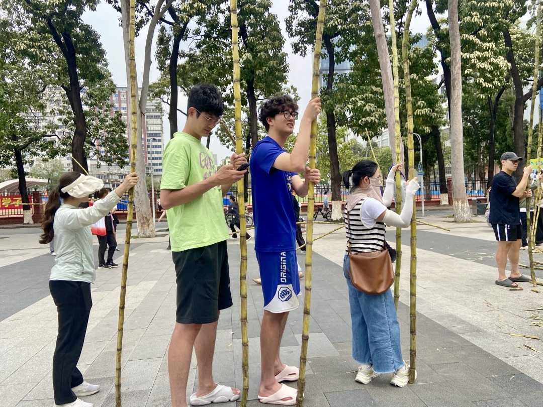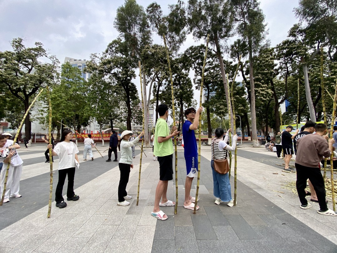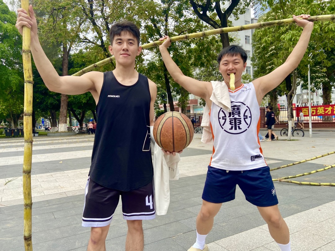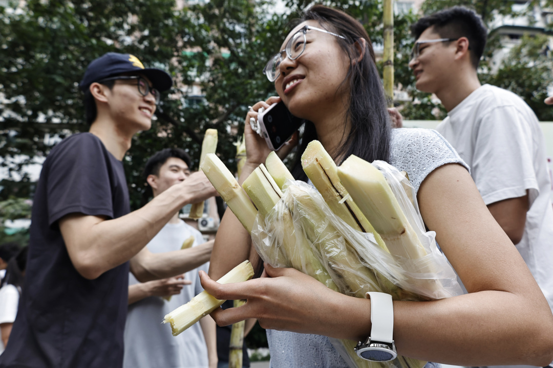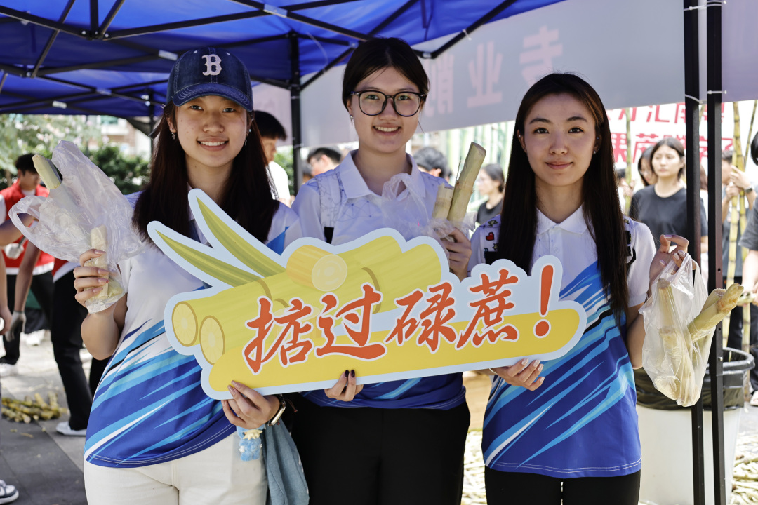 记者在现场看到,迎面走来的一群男生都有两米左右,扛起甘蔗有说有笑,用自己两米的身高丈量起来,显然这蔗足有三米五长!有的学生更是徒手断甘蔗,尽显体育院校特色。每人手握一根甘蔗,乍一看,好似一个个勇猛的壮士;学生们个个满脸堆笑,这新鲜甘甜的甘蔗不仅免费发放,还有志愿者帮忙削好皮。同学们举着甘蔗合影打卡,有的打电话叫同学来“同甘共甜”,有的女大学生面对镜头一边吃一边点赞,笑得甜蜜蜜!