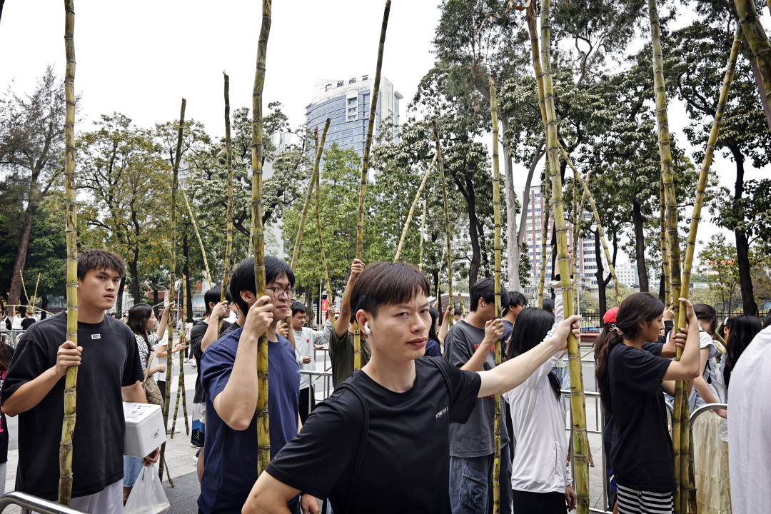 3月24日中午,广州体育学院领取现场热闹非凡。 学生领取区和专业削皮区都排起长队,一根根黄皮甘蔗分到学生手中。此次为广体师生专程送来的,是口感清润、汁水丰沛的黄皮甘蔗,有别于其他院校发放的黑皮品种。遮阳棚上贴着“节节攀登”“步步回甘”等祝语,处处可见三两学子协力扛起标志性的“广体甜蔗”,欢声笑语不断。