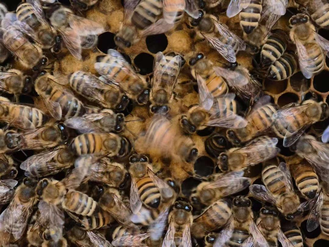 图片中央的蜜蜂正在跳“摇摆舞”,旁边的蜜蜂正在围观,“观众”数量影响了舞蹈的表达。(董诗浩摄)