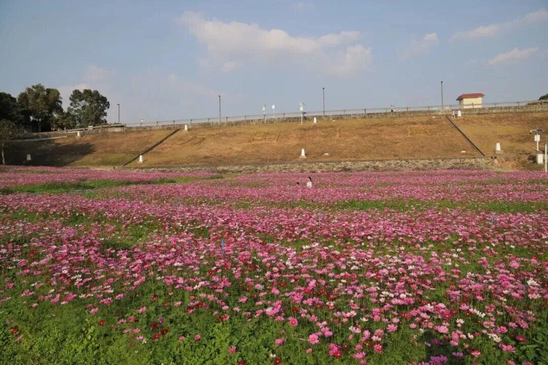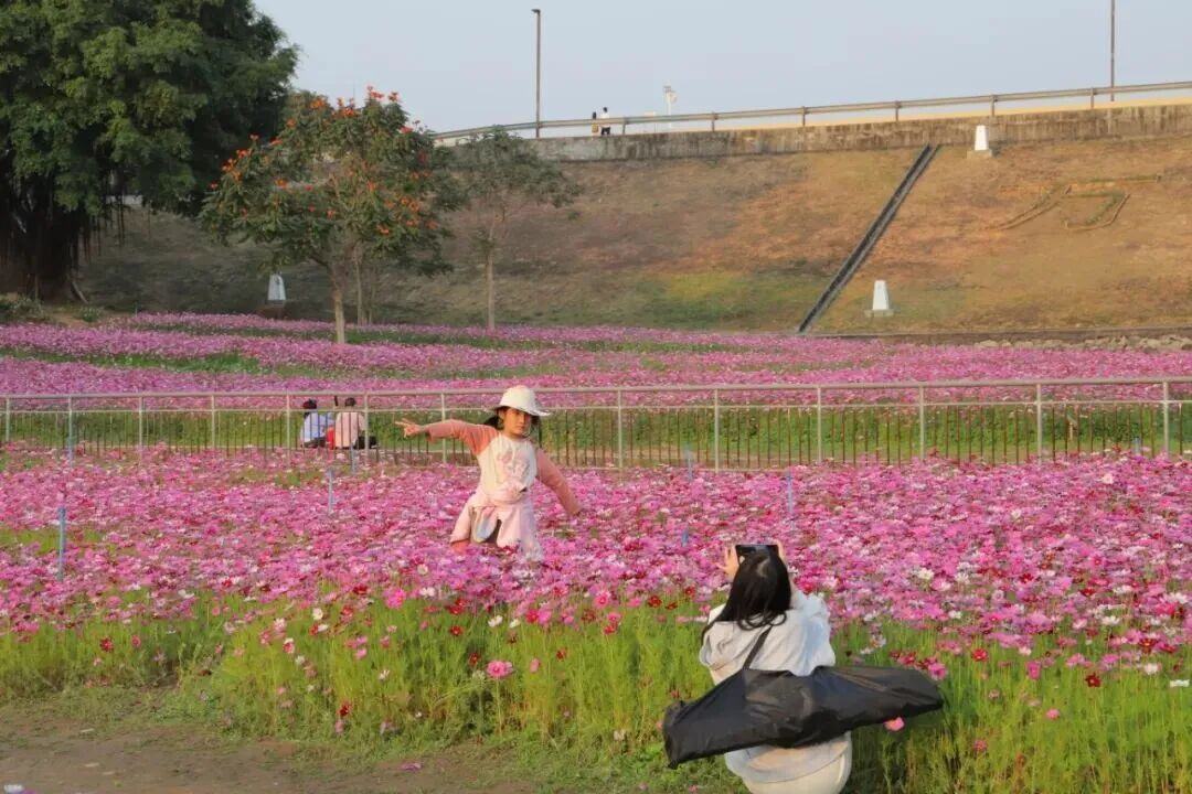 走进新塘镇万田生态公园,1万多平方米的格桑花陆续绽放,紫红色、粉红色、白色的花朵错落交织,漫山遍野的花海如油画般绚烂。