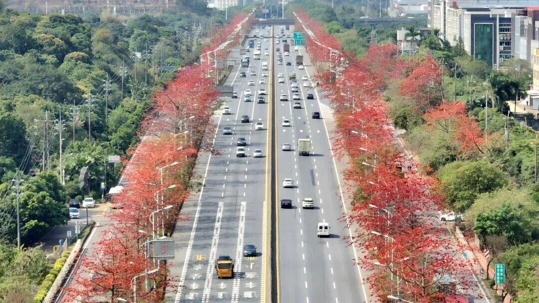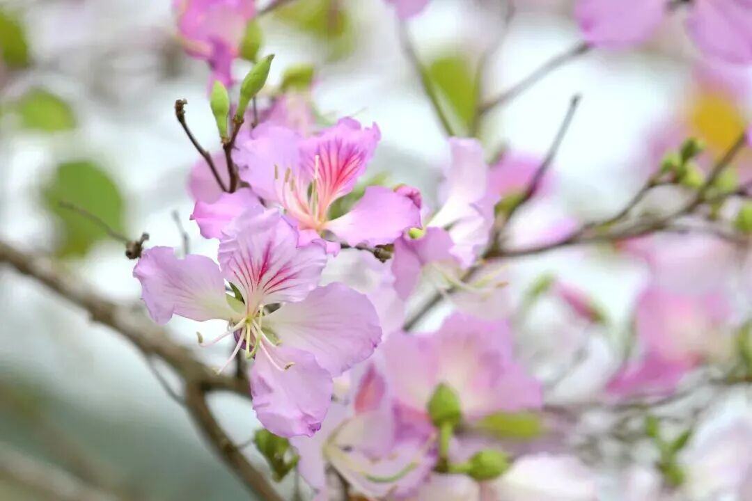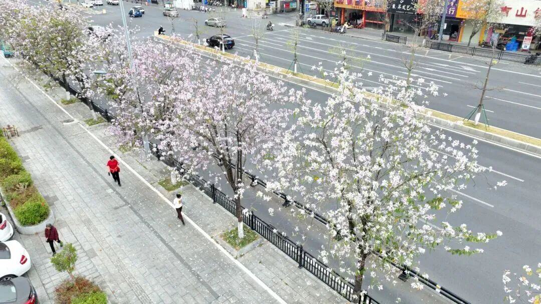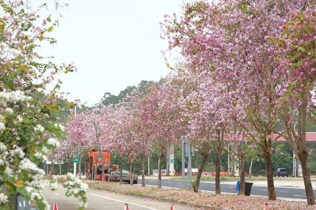 增城区荔城大道、府佑路以及从莞深高速河洞服务区的紫荆花迎来盛花期。粉紫与纯白的花朵缀满枝头,将城市道路与交通枢纽装点成浪漫花廊。