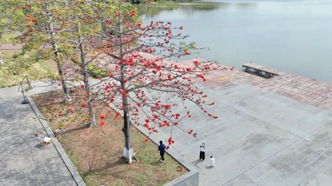 在荔湖广场盛放的木棉花下,三五成群的市民漫步于绿意之间,构成春日里富有生活气息的幸福图景。