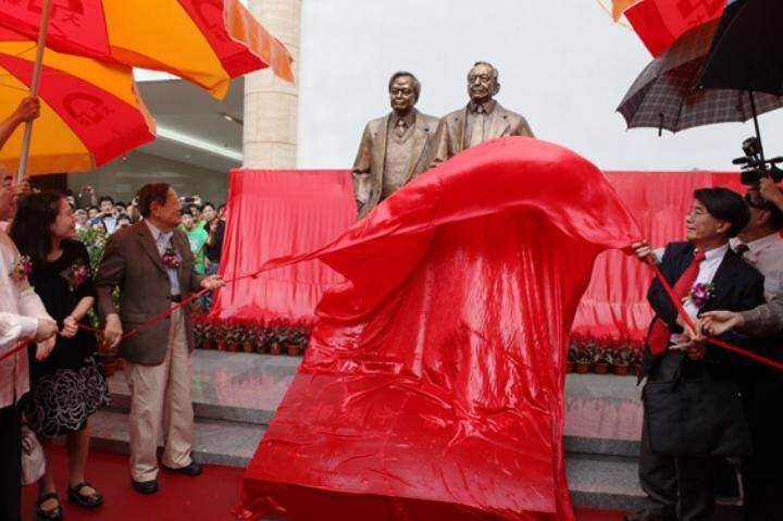 组图4:2012年,杨振宁偕翁帆为《陈省身与杨振宁》雕像揭幕。杨振宁先后六次到东莞理工学院考察指导,并专门为莞工学子设立“杨振宁奖学金”。