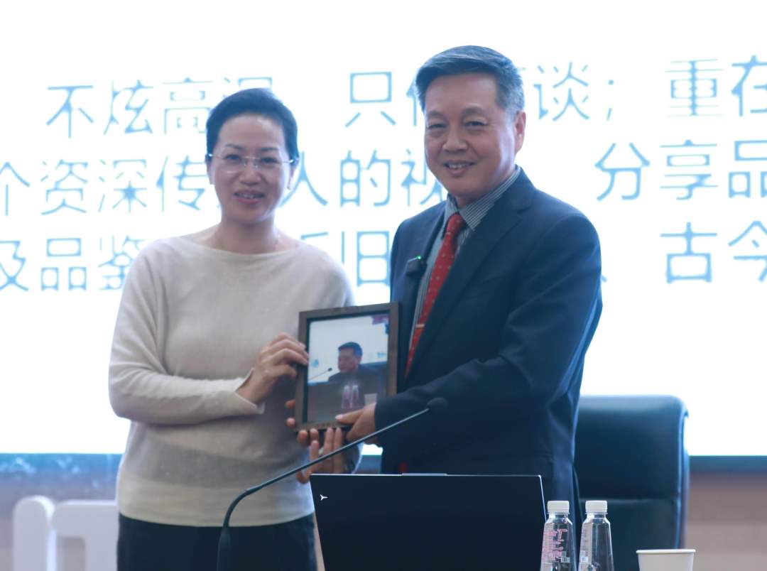 东莞理工学院国际设计学院院长、非遗学院院长许燕转(左)向主讲人赠送《授课时光》照片