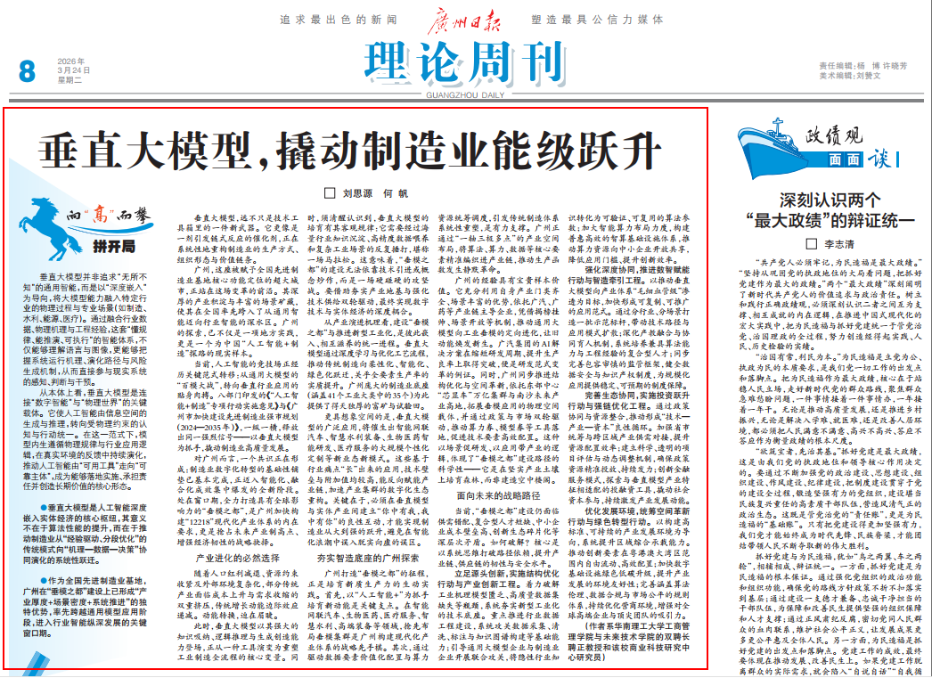对广州而言,一个共识正在形成:制造业数字化转型的基础性铺垫已基本完成,正迈入智能化、融合化成效集中爆发的全新阶段。处在窗口期,全力打造具有全球影响力的“垂模之都”,是广州加快构建“12218”现代化产业体系的内在要求,更是抢占未来产业制高点、增强经济韧性的战略抉择。