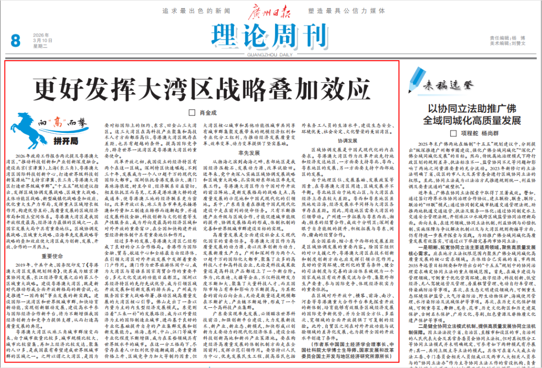 2026年政府工作报告两次提及粤港澳大湾区,“推动科技创新和产业创新深度融合。建设北京(京津冀)、上海(长三角)、粤港澳大湾区国际科技创新中心,打造世界级科技创新策源地”“支持京津冀、长三角、粤港澳大湾区打造世界级城市群”。“十五五”规划建议指出,发挥区域协调发展战略、区域重大战略、主体功能区战略、新型城镇化战略叠加效应,优化重大生产力布局,发挥重点区域增长极作用,构建优势互补、高质量发展的区域经济布局和国土空间体系。粤港澳大湾区是我国开放程度最高、经济活力最强的区域之一,在国家发展大局中具有重要地位。区域协调发展战略、区域重大战略、沿海率先发展战略等战略的叠加效应使大湾区成为创新、发展、开放、合作的一片热土。