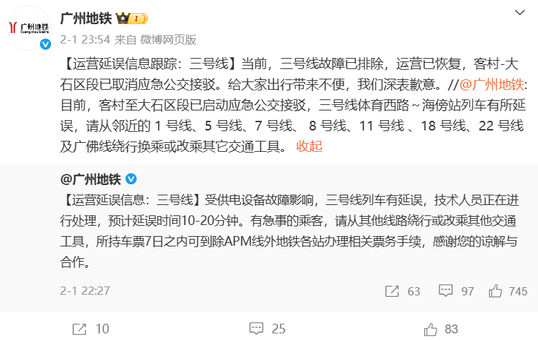2月1日晚,微博号“广州地铁”发布微博“运营延误信息:三号线”称,受供电设备故障影响,三号线列车出现延误。