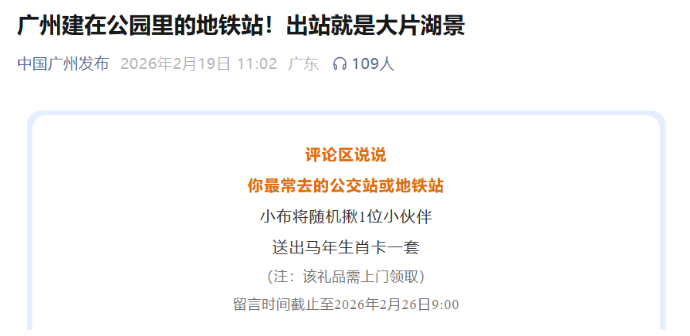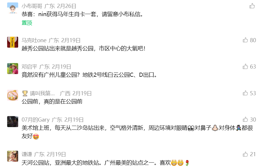 另一方面,抽奖活动获网民积极参与,形成高度互动。文章发起“你最常去的公交站或地铁站”抽奖活动,网民纷纷留言跟评参与,越秀公园站、白云公园站、公园前站等多条评论热度居前。目前,该文章收获462人次在看量、1139人次点赞量,位居2月广州市政务微信文章互动量首位。