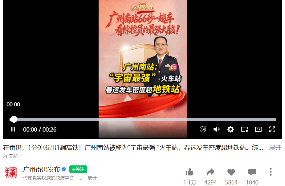 2月14日,微信视频号“广州番禺发布”发布《在番禺,1分钟发出1趟高铁!广州南站被称为“宇宙最强”火车站,春运发车密度超地铁站。综控员田丽:左右开弓、眼观六路、耳听八方!》,一是上下双屏呈现车站大客流量与高效调度。该视频以上下双屏、数据化呈现广州南站“1分钟发车”“17趟列车同时检票”高频次发车密度、客流量大,以及综控员协调列车停靠、处理突发情况,使网民直观感受车站运营、高效调度的不易。