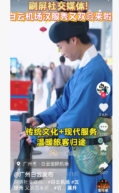 作为白云机场春运系列文化活动,由防爆检查与巡逻岗位工作人员换装的“宋服卫士”活动自1月31日起拉开帷幕,具有仪式感和沉浸式的文化体验刷屏多个社交平台,获赞交通枢纽从“功能满足”到“情感共鸣”“体验赋能”的服务理念升级。