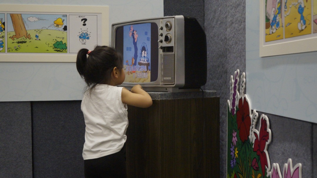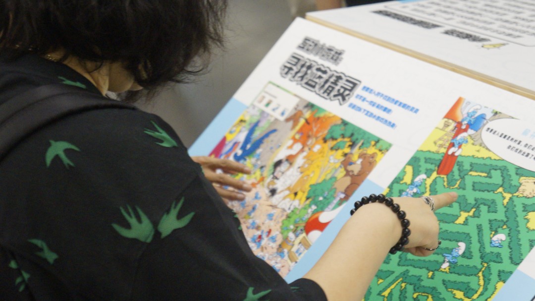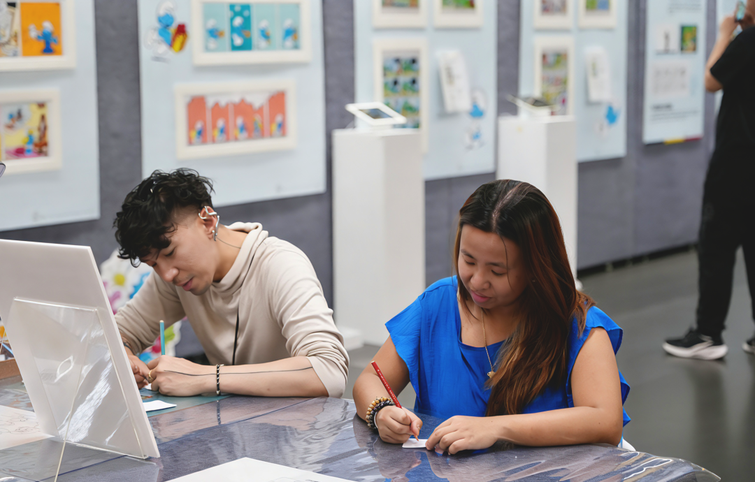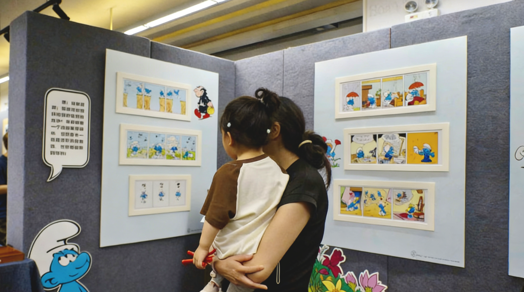 广东是蓝精灵登陆中国的第一站。1983年,广东电视台首次引进《蓝精灵》动画,将法语原名“Les Schtroumpfs”译为“蓝精灵”,并邀请广州军区战士歌舞团的艺术家瞿琮、郑秋枫创作了传唱至今的《蓝精灵之歌》。自此,那些头戴白帽的蓝色小精灵从荧幕里蹦出来,走进千家万户,成为一代中国人的童年记忆。展览现场滚动播放的《蓝精灵》动画片吸引了大小朋友的眼球;另一边,展区内的漫画工作台也“人气满满”,读者一边对照《蓝精灵》角色设计稿,一边用画笔创作自己的“蓝精灵”。