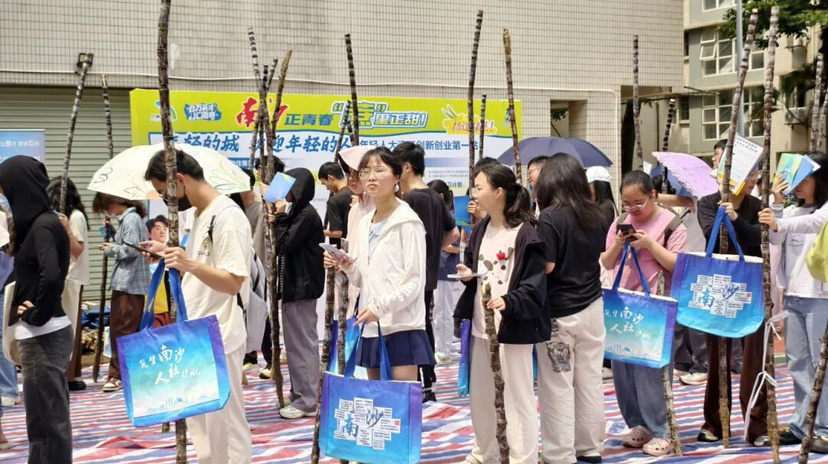 南沙更借送蔗的契机,在各发放点同步设立就业创业摊位,国际人才服务官团队现场为学子宣讲人才引进政策、发放政策指南,把果蔗的清甜,延伸到青年人才的职业生涯中。